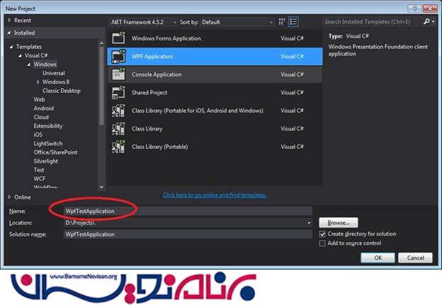 مرحله اول: یک پروژه با نام ‘WpfTestApplication’ در WPF ایجاد کنید.