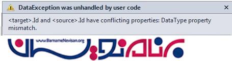 نوع داده ها باید یکسان باشند. اگر نام ستون ها در هر دو جدول یکسان باشد اما نوع داده ی آن ها متفاوت باشد، خطایی مطابق زیر دریافت خواهیم کرد: