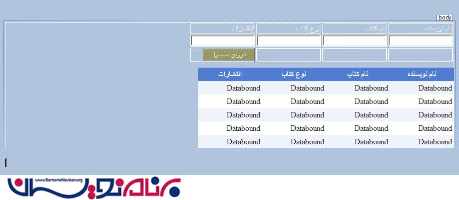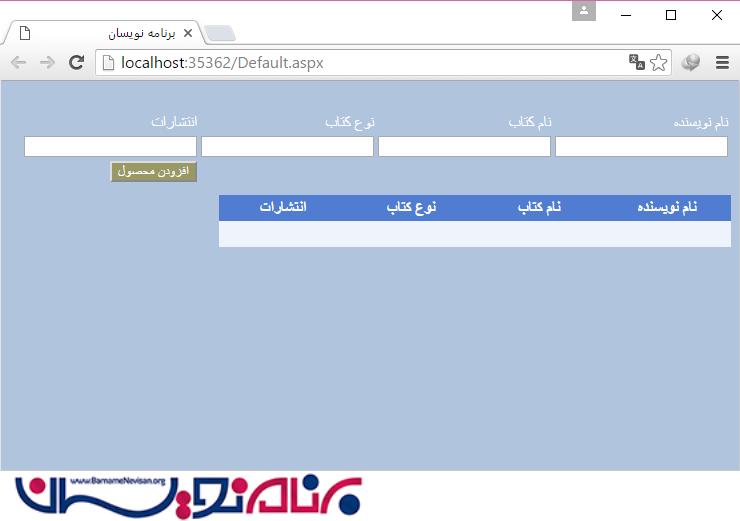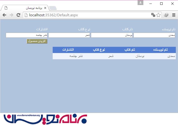 حالا چند داده در textbox ها وارد کنید بر روی دکمه ی افزودن کلیک کنید. می بینید که داده ها در GridView نمایش داده خواهند شد: