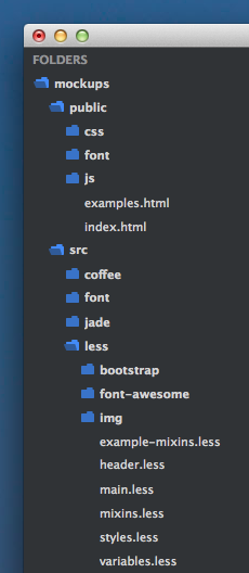 ما معمولا انواع پوشه های src را در Less خود نگهداری می کنیم(و jade و coffeescript).همه ی این فایل ها درنهایت به صورت یک دایرکتوری "عمومی"کامپایل می شوند که خروجی آن پروژه ی واقعی ما می باشد .شما لازم نیست که از هیچ قالب زبان HTMLی استفاده کنید البته ، شما هنوز می توانید از این متد فقط برای Less استفاده کنید.