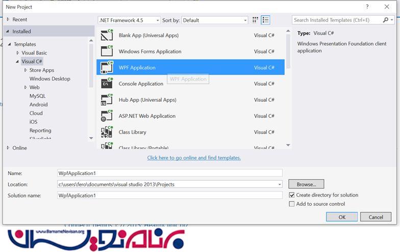 مرحله 1: یک برنامه ی empty WPF با استفاده از Visual Studio ایجاد کنید، نام مورد نظر برای برنامه را وارد کنید و بر روی OK کلیک کنید.