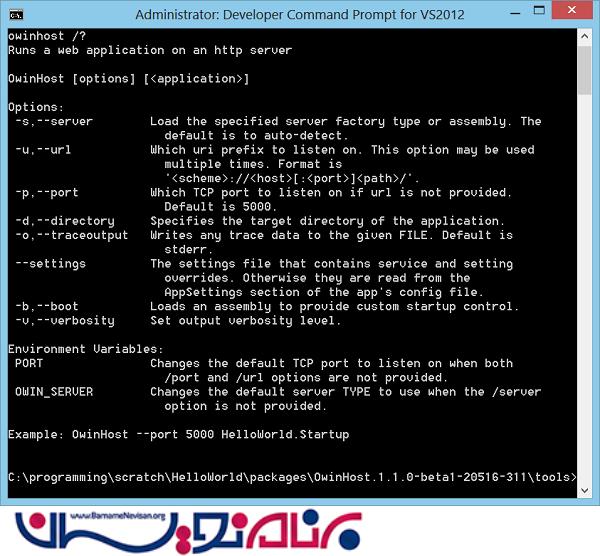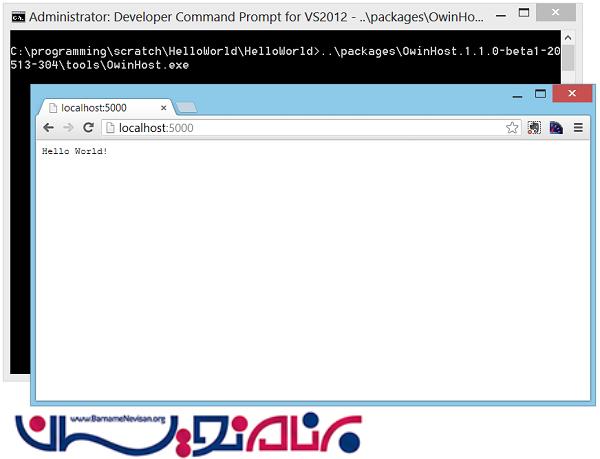 از قسمت command line ، ما می توانیم آدرس دهی را به پوشه ی root پروژه ارجاع بدهیم و سپس به راحتی OwinHost.exe را اجرا کنیم. (که در پوشه ابزار مربوط به NuGet Package نصب شده است). به طور پیش فرض ، OwinHost.exe برای جستجوی HttpListener-based server پیکر بندی شده است و بنابراین به پیکر بندی اضافی نیازی نخواهیم داشت. آدرس را در مرورگر وب به صورت http://localhost:5000/ وارد می کنیم و به این ترتیب برنامه ما که از طریق console در حال اجرا شدن است ، نمایش داده می شود.