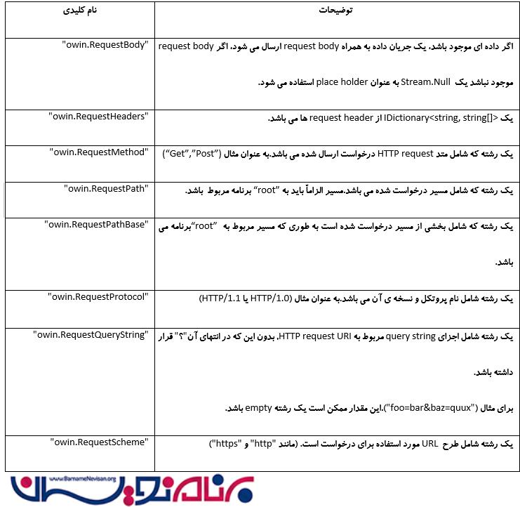 بخش OWIN specification علاوه بر این که نوع environment dictionary را تعیین می کند، همچنین یک لیست از dictionary های key value pair (جفت کلید-مقدار) نیز تعریف می کند. به عنوان مثال، جدول زیر کلیدهای dictionary مورد نیاز برای یک درخواست HTTP را نمایش می دهد: