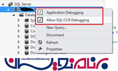 روی دیتابیس خود کلیک راست کنید و گزینه های Application Debugging و Allow SQL/CLR Debugging را تیک بزنید. ( عکس زیر را مشاهده کنید)