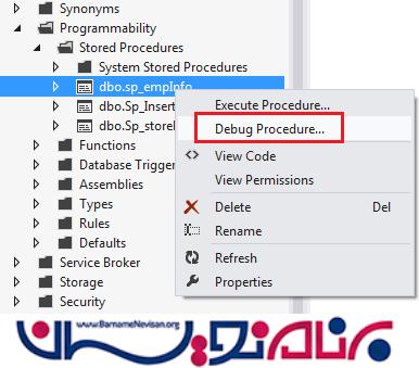 روی SP مورد نظر خود راست کلیک کنید و Debug Procedure را انتخاب کنید.
