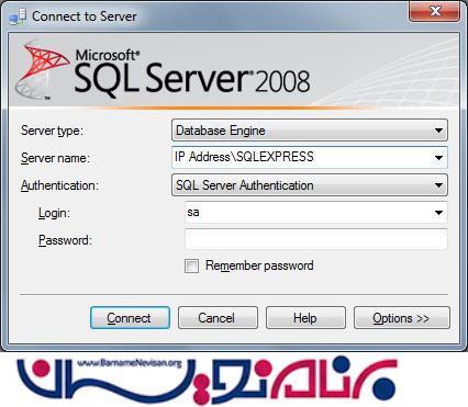 -روی Connect Database Engine کلیک کنید و نام کاربری و کلمه عبور خود را وارد کنید و روی دکمه ی Connect کلیک کنید.(عکس زیر را مشاهده کنید)