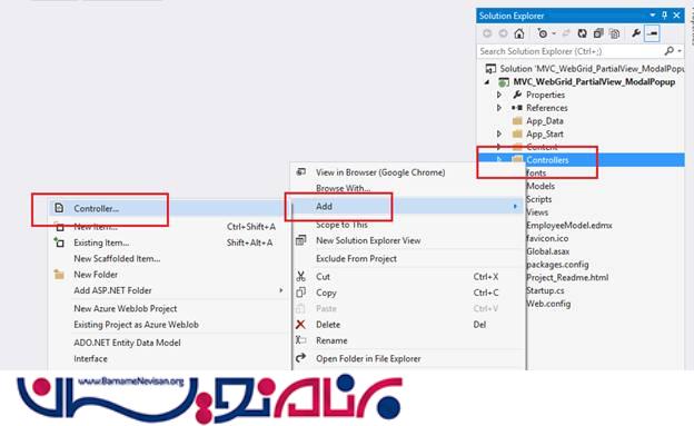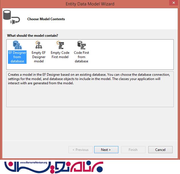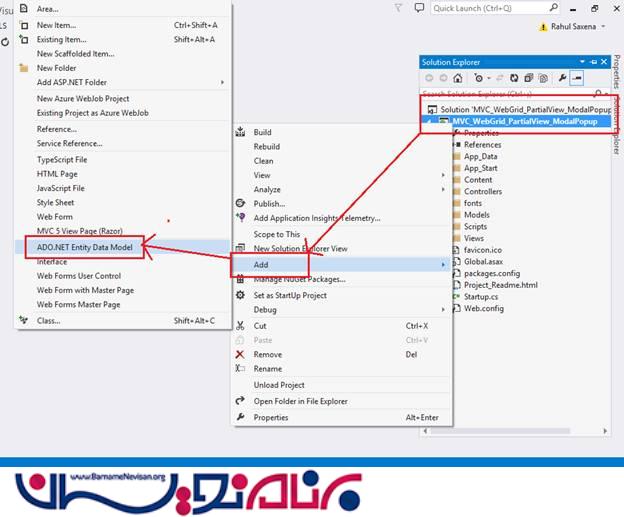 حالا بر روی Solution Explorer در پروژه کلیک راست کرده و Add را انتخاب کنید و یک ADO.NET Entity Data Model به پروژه اضافه کنید.