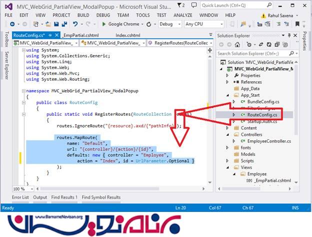 در Route.config ، startup controller و action را مطابق زیر تغییر بدهید: