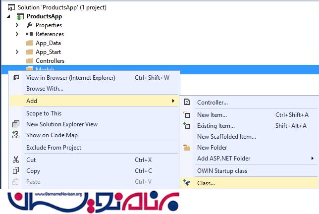 اگر Solution Explorer قابل رویت نمی باشد ، منوی View را کلیک کنید و Solution Explorer را انتخاب کنید . در Solution Explorer روی پوشه ی Model راست کلیک کنید از منوی Context ، ابتدا Add و سپس Class را انتخاب کنید.