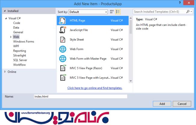 در Add New Item ، در Web در زیر # Visual C ، و سپس آیتم HTML Page را انتخاب کنید .نام صفحه را "index.html" بگذارید.