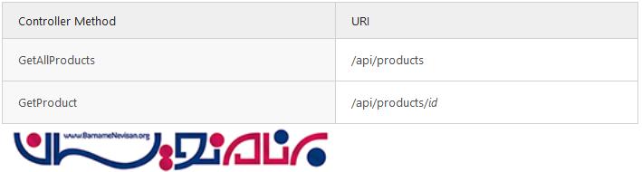 برای متد GetProduct ، id در URL یک Placeholder می باشد.برای مثال ، برای گرفتن محصولی با ID برابر 5، URL آن به این شکل می شود: api/products/5