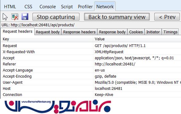 اگر شما تب Response body را کلیک کنید، شما می توانید ببینید که چگونه لیست محصولات به JSON ، Serialized شده است .مرورگرهای دیگر دارای قابلیت های مشابه می باشند.یک ابزار کاربردی دیگری که وجود دارد Fiddler می باشد که یک web debugging proxy می باشد.شما میتوانید برای نمایش ترافیک HTTP و همچنین برای نوشتن درخواست های HTTP از Fiddler استفاده کنید، که به شما کنترل کاملی بر روی هدرهای HTTP در درخواست ها می دهد.