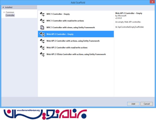در قسمت Add Scaffold ،Web API Controller - Empty را انتخاب کنید و روی ADD کلیک کنید.