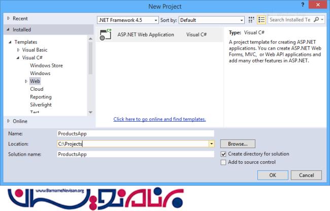 Visual Studio را باز کنید و New Project را انتخاب کنید .یک پروژه Web ایجاد کنید و نام پروژه را "ProductsApp"بگذارید و روی OK کلیک کنید.