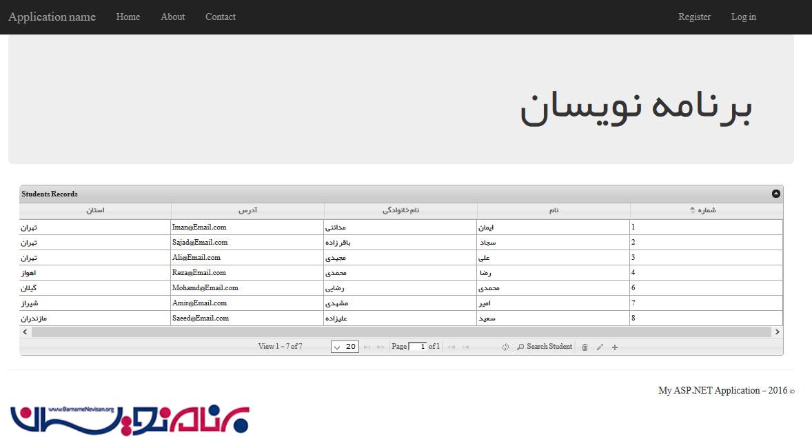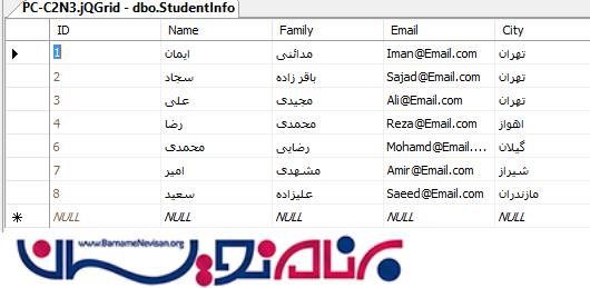 هنگامی که فایل script.js در صفحه بارگذاری شود Action GetJqGridData فراخوانی شده و داده ها درون جدول قرار میگیرند.