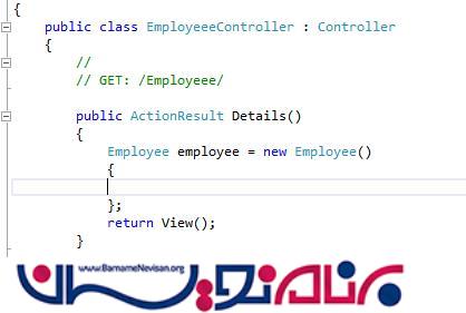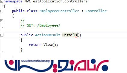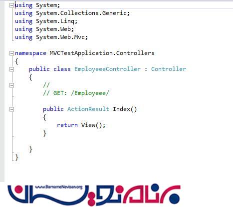 به کدهای بالا نگاه کنید . یک کلاس با نام EmployeeeController در پوشه Controller ساخته شده است که یک Action Methode با نام پیش فرض Index در آن وجود دارد .