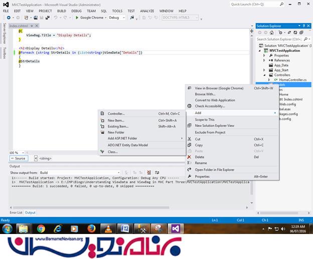حالا ، باید اطلاعات را به view ارسال کنیم تا view آنها را به نمایش بگذارد . برای این کار یک view به پروژه اضافه کنید . برای این کار روی Action Methode کلیک راست کرده و view را Add کنید .