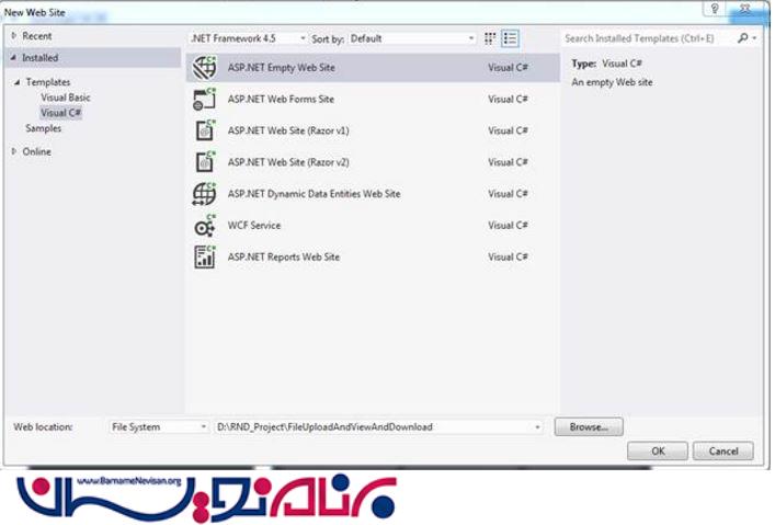 ساختن یک صفحه ی پروژه ASP.NET Empty Web Site به نام FileUploadAndViewAndDownload