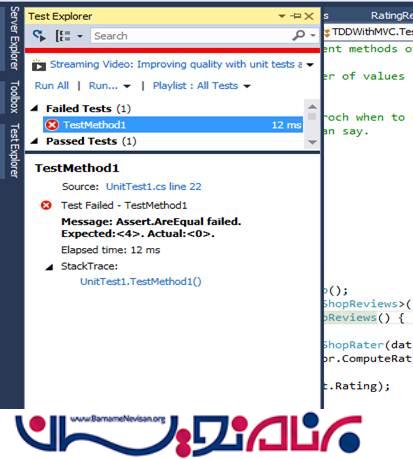 7-حالا باید Unit test را اجرا کنید. البته این اجرا با موفقیت نخواهد بود، ولی اولین مرحله برای ساخت TDD است.
