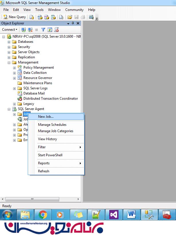 3. در قسمت Object Explorer در قسمت SQL Server Agent بر روی Jobs کلیک راست کرده و بروی New Job کلیک کنید.