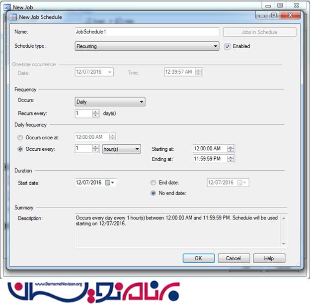 8.در New Schedule window ما برای Job برنامه ریزی ایجاد می کنیم تا هر ساعت به طور خودکار پارامتر انتخاب کند.