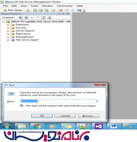 2.برای چک کردن آن در Sql server قسمت Object Explorer اگر Agent به رنگ قرمز باشد به این معنی است که درحال اجرا نیست ، بنابراین بروی Sql server Agent کلیک راست کرده و گزینه Start را میزنیم.ومیتوان همچنین از طریق Service.msc این کار را انجام داد با زدن دکمه ویندوز و R (Winodws+R ) صفحه Run برای شما باز می شودکافی است Service.msc را تایپ کنید و بروی OK کلیک کنید.