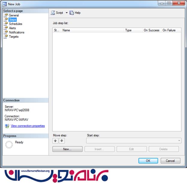 5.حال به تب بعدی بروید "Step" در این تب باید Job خود را تعریف کنید . حال بر روی دکمه New کلیک کنید تا یک پنجره برای شما باز شود حال اسم Step خود را وارد کنید .