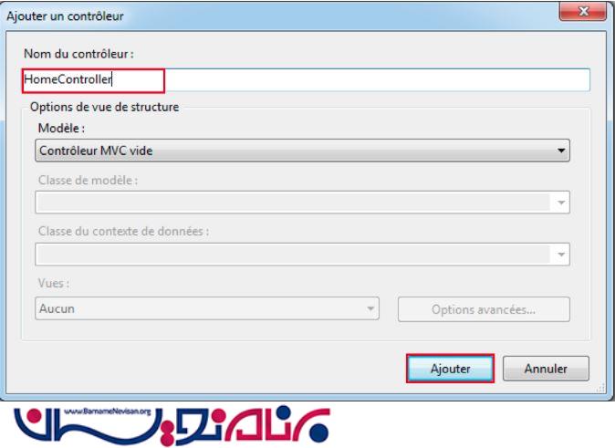روی فولدر راست کلیک کنید و یک Controller با نام ‘HomeController’ را به پروژه اضافه کنید .