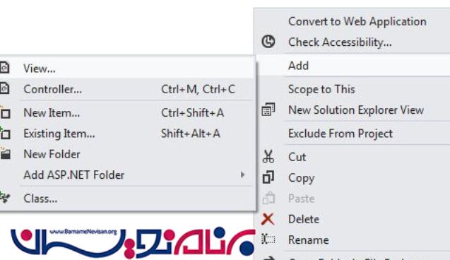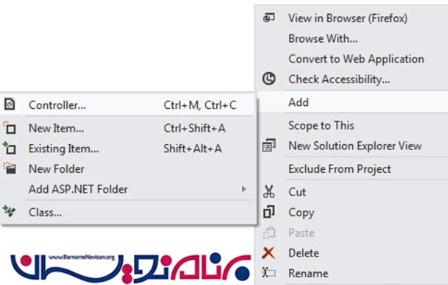 حال میخواهیم یک Controller به پوشه Controller اضافه کنیم ، برای این کار بر روی پوشه کلیک راست کرده در قسمت Add ، Controller را انتخاب کنید.