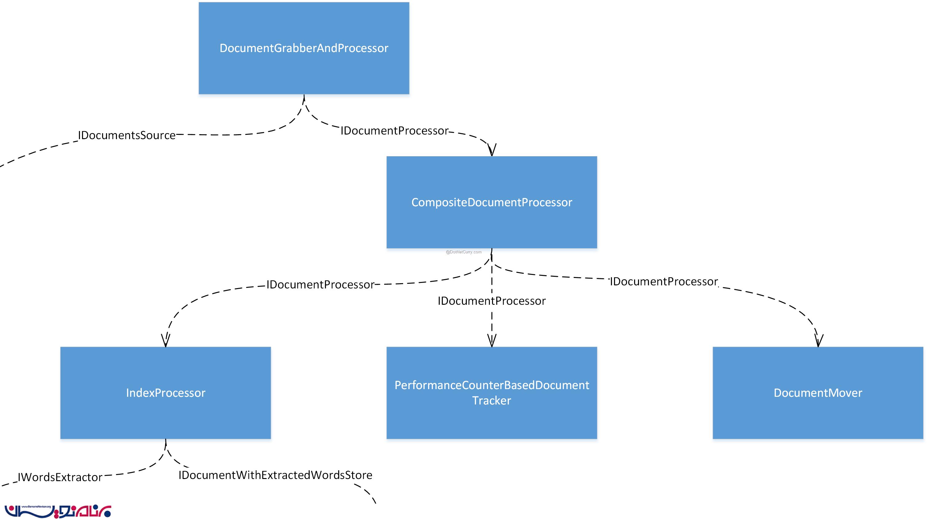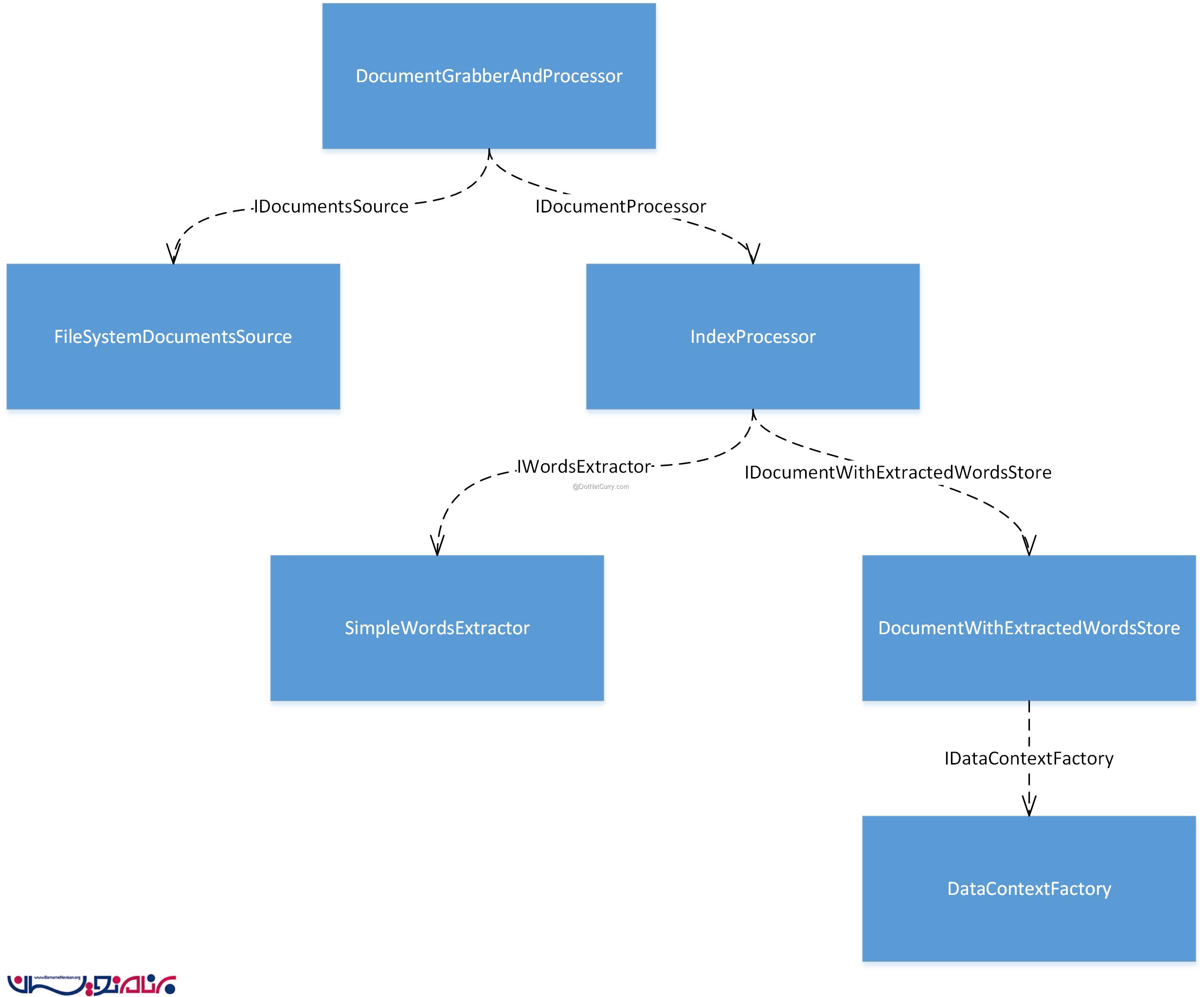 در حال حاضر، ما یک FileSystemDocumentsSource داریم که اسناد را از file system دریافت می کند. برای IDocumentProcessor ما یک کلاس IndexProcessor داریم که با استفاده از وابستگی IWordsExtractor کلمات را از اسناد استخراج می کند و سپس از وابستگی IDocumentWithExtractedWordsStore برای ذخیره اسناد و کلمات استخراج شده استفاده می کند.