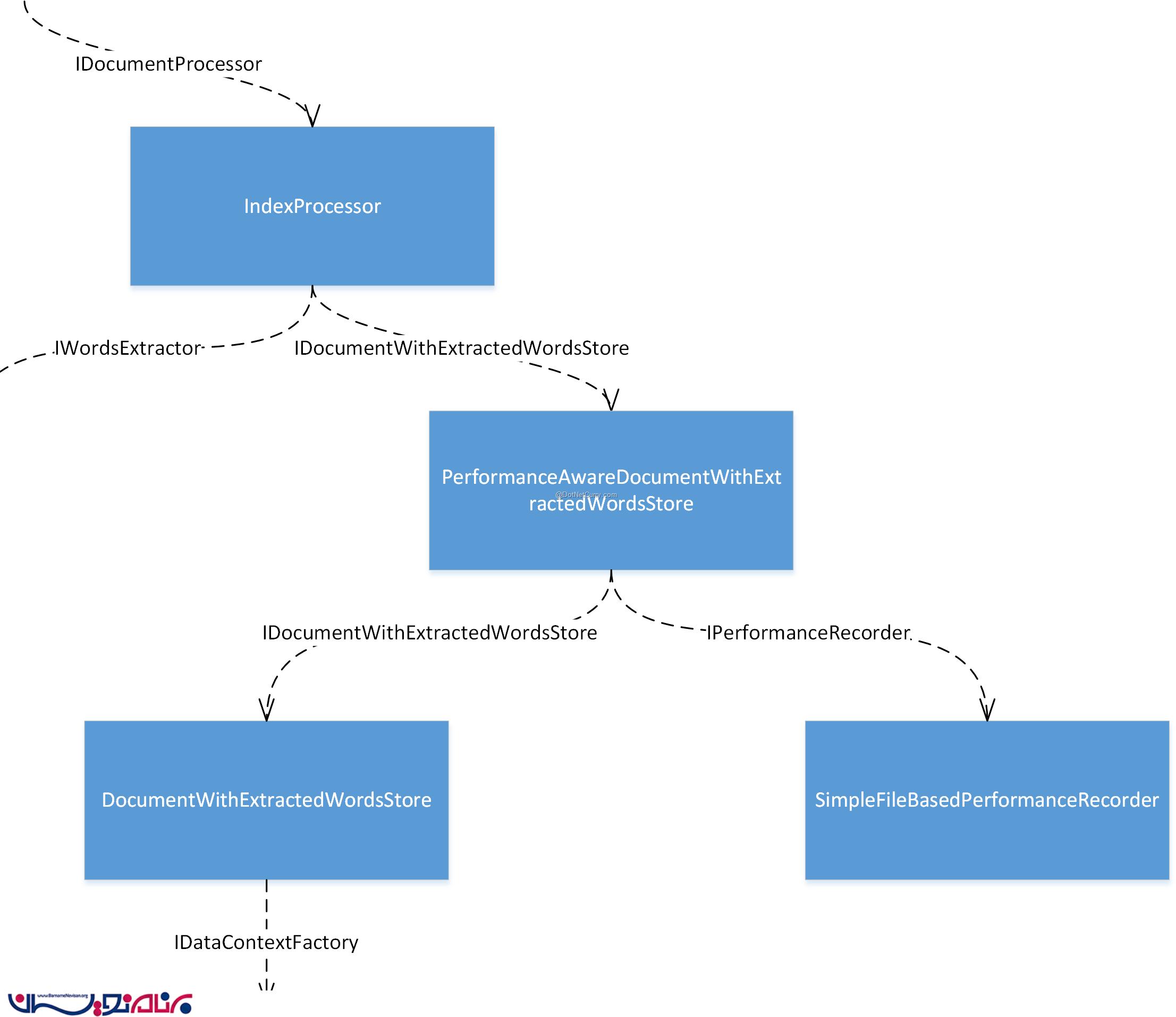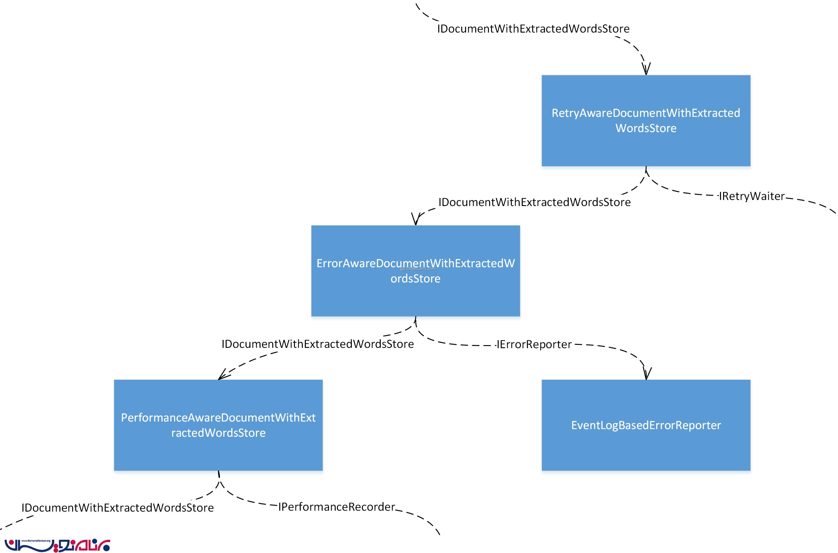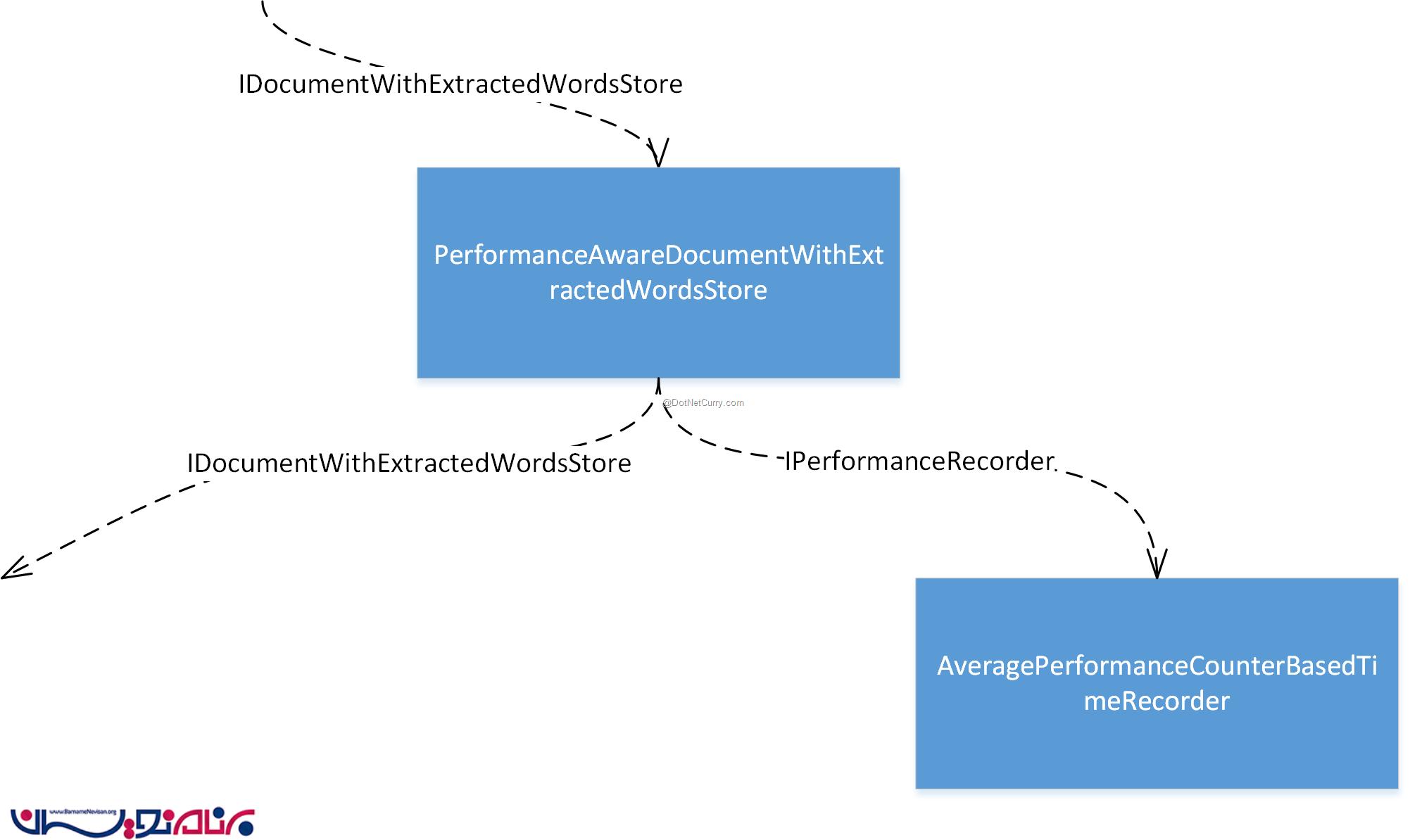 ببینید که ما چگونه یک نمونه از کلاس جدید را در بالای شی PerformanceAwareDocumentWithExtractedWordsStore تزریق کرده ایم . (تا به منزله ی یک decorator برای آن باشد.). ما می توانیم این کار را با روش های دیگری نیز انجام بدهیم. این تغییر را می توانید در تصویر زیر ببینید :