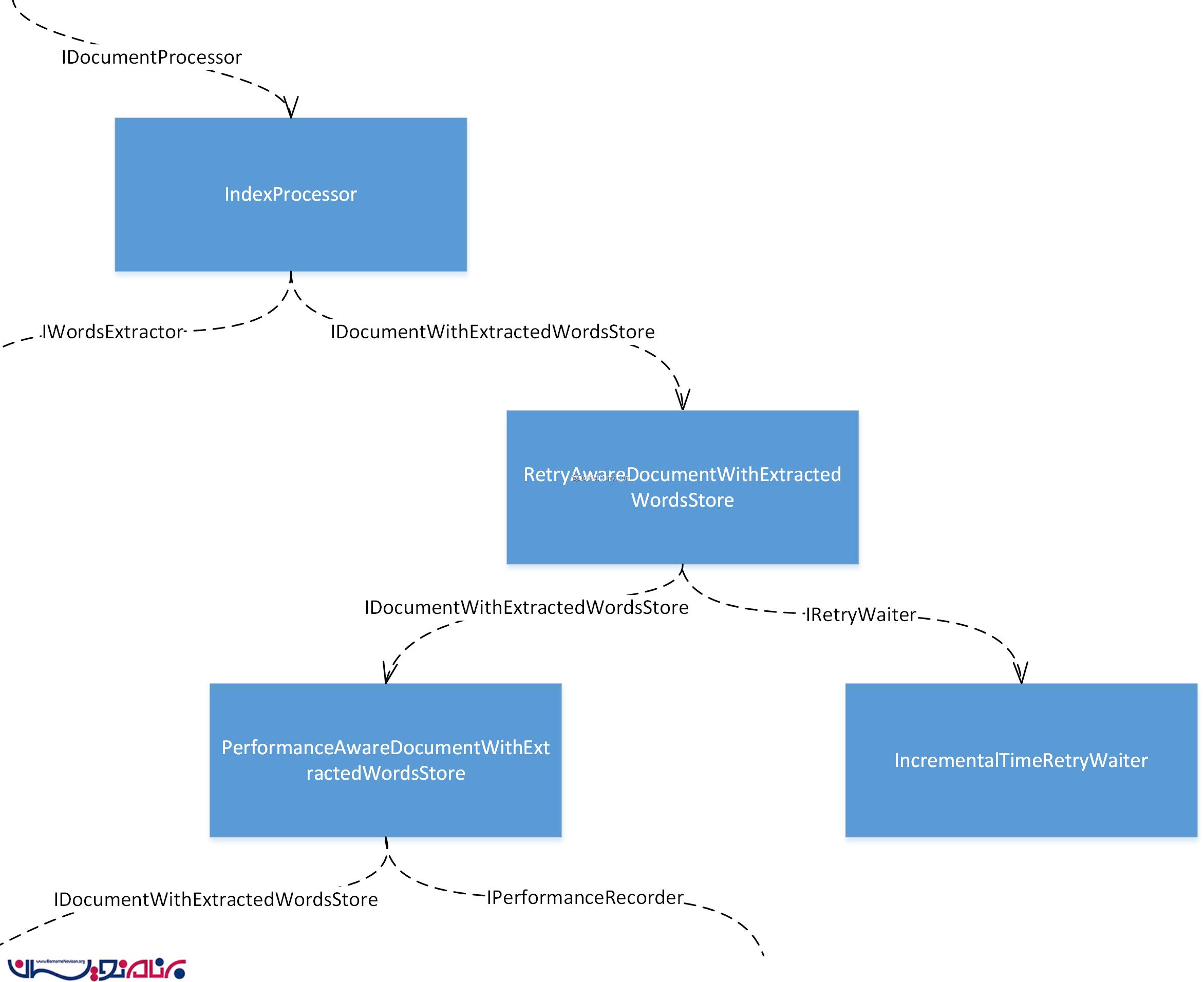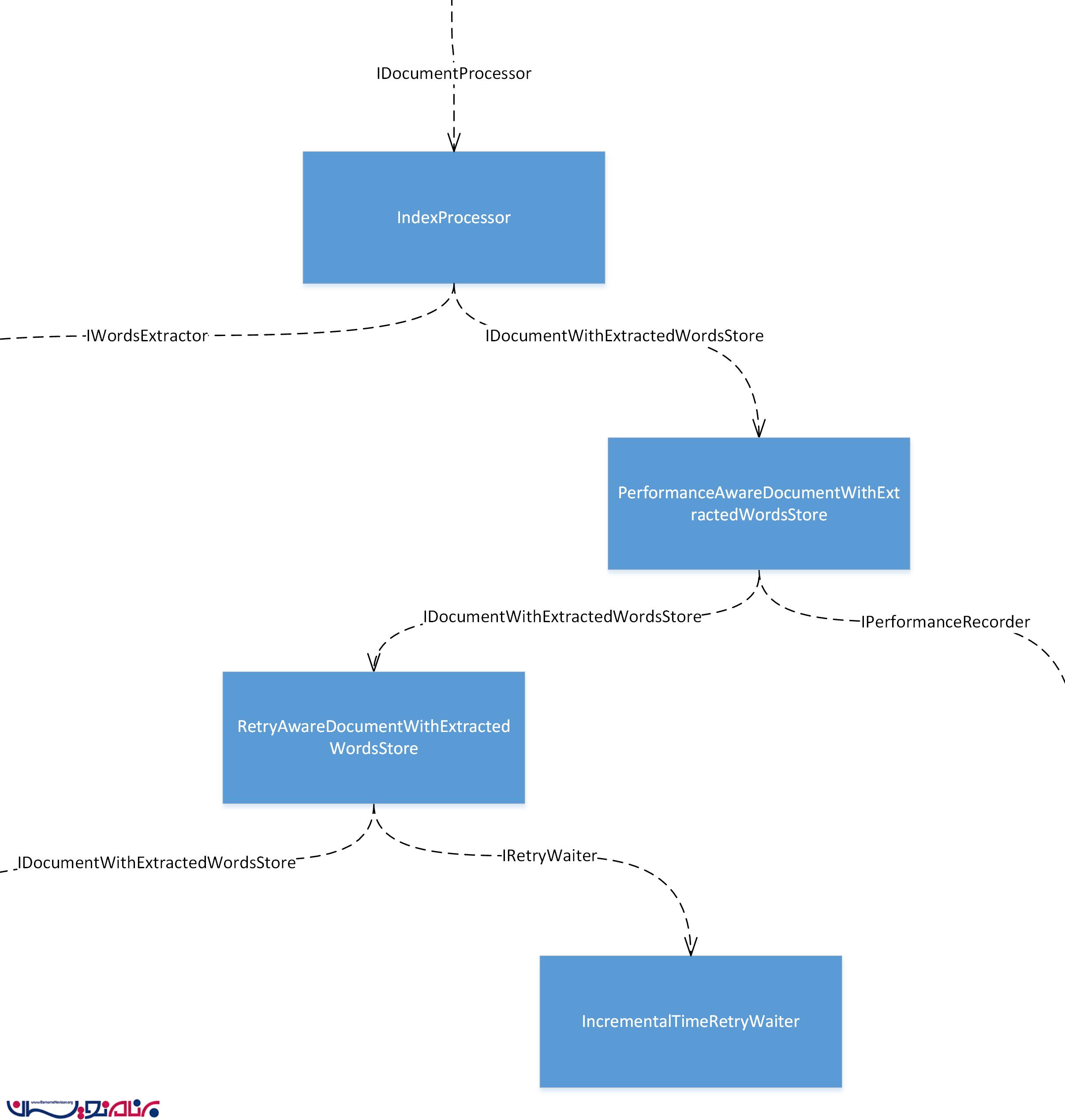 ما در این مرحله می خواهیم یک decorator برای IDocumentWithExtractedWordsStore ایجاد کنیم تا بتواند متد مربوط به ذخیره سازی سند را چندین بار تکرار کند. ما فعلا این decorator را RetryAwareDocumentWithExtractedWordsStore می نامیم. ما برای این که بتوانیم استراتژی های مختلفی برای تزریق استفاده کنیم نیاز داریم تا این کلاس را به اینترفیس IRetryWaiter وابسته کنیم. implementation جاری از IRetryWaiter ، IncrementalTimeRetryWaiter زمان انتظار را به وسیله یک مقدار ثابت، هر بار اضافه می کند.