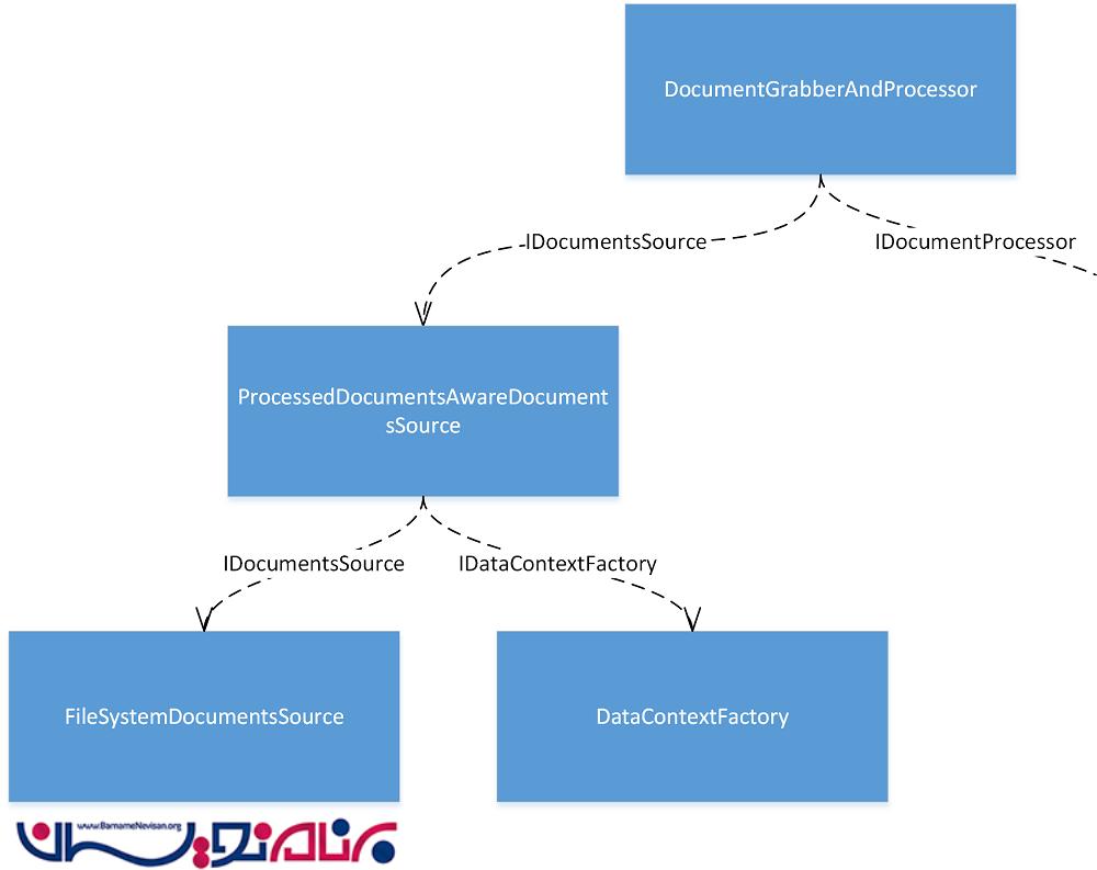 ما یک decorator برای IDocumentsSource ایجاد خواهیم کرد که با پایگاه داده ارتباط برقرار می کند و اسنادی که تا به حال پردازش شده اند را قبل از ارسال خروجی ها به کاربر، فلیتر می کند و نام آن را ProcessedDocumentsAwareDocumentsSource می گذاریم. بخشی از object graph که مربوط به این بخش است، به صورت زیر می باشد: