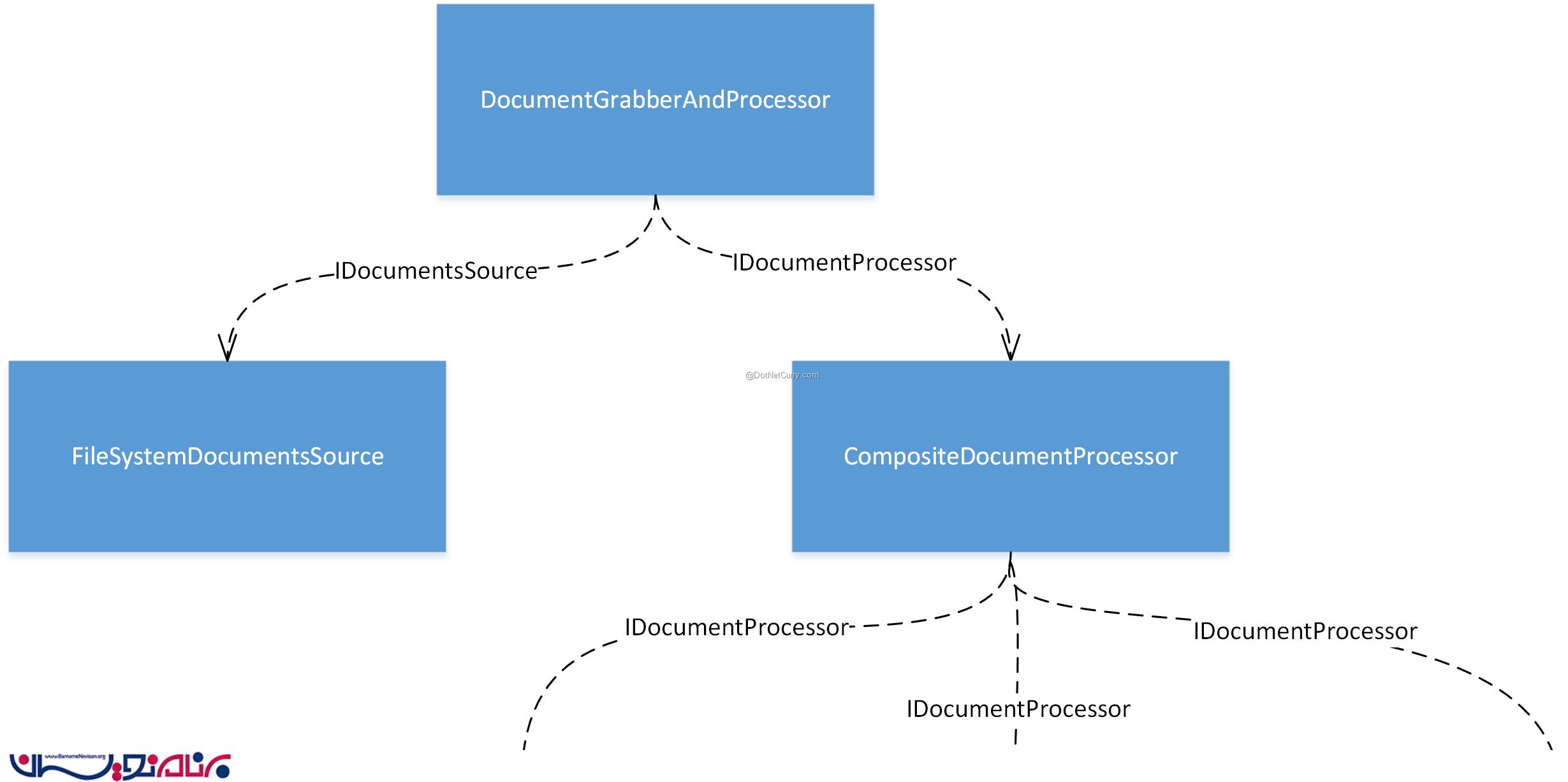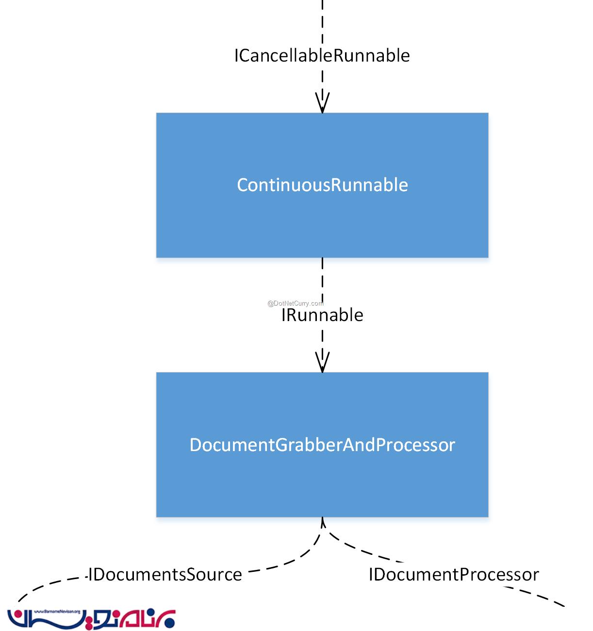 شی DocumentGrabberAndProcessor شی اصلی است، و اینترفیس IRunnable را پیاده سازی می کند ، به همین خاطر به این وسیله می تواند وظایفش را انجام بدهد. همچنین می تواند از وابستگی IDocumentsSource برای شناسایی اسناد و ارسال آن ها به بخش IDocumentProcessor جهت بررسی، استفاده می کند.