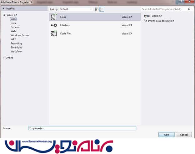 دوباره روی solution راست کلیک کنید -> Add new Item->Class File -> نام کلاس را Employee.cs بگذارید.