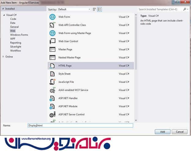 حال ، ما صفحه ی HTML را اضافه می کنیم و این رکوردها را نمایش می دهد.بنابراین ، برای اضافه کردن HTML Page روی Solution راست کلیک کنید -> Html Page -> و نام Display.html را مانند زیر بگذارید:
