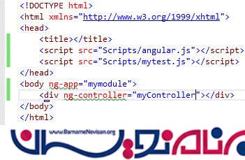 در صفحه ی HTML ، ما اسم ماژول را در ng-app در تگ body و نام Controller را در ng-controller قرار می دهیم.