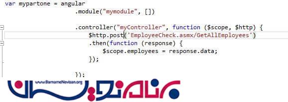 در تابع ، ما $http را برای گرفتن پاسخ از سرویس خود پاس می دهیم و در $http.get ، ما نام سرویس و نام تابع را در قالب ‘servicename/functionname’می نویسیم که بعدا به صورت غیر همزمان فراخوانی خواهد شد.بنابراین ، تابع anonymous دیگری را اضافه کنید به عنوان مثال یک پاسخ employee را به شی $scope اضافه می کند.