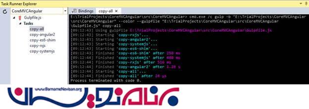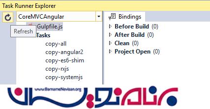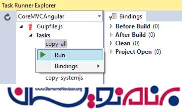 برای اجرای task های gulp ، بر روی فایل FileGulp کلیک راست می کنیم و Task Runner Explorer را انتخاب می کنیم .