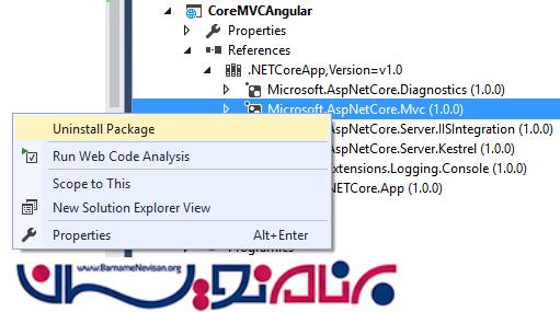 برای حذف ، میتوان بر روی Package کلیک راست کرده و Uninstall package را انتخاب کنیم