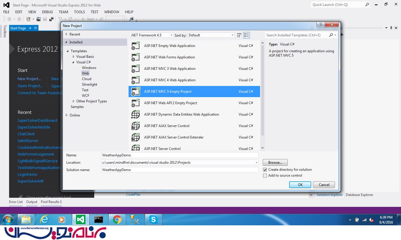 با استفاده از net framewrok version 4.5. یک پروژه جدید با نام WeatherAppDemo ، ایجاد کنید . ما از .net 4.5 استفاده میکنیم ، برای اینکه توانایی استفاده از آخرین نسخه SignalR 2.x را داشته باشیم .