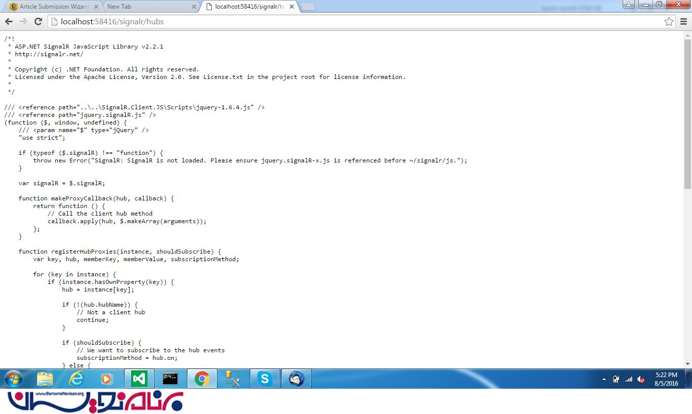 حال،کد را Compile کنیدو "/signalr/hubs" را به url ضمیمه کنید.شما تعدادی کدJavaScript خواهید داشت. اگر توانستیدکه کدهای Javascript را ببینید،آنگاه شما موفق به پیکربندی یک signalR server