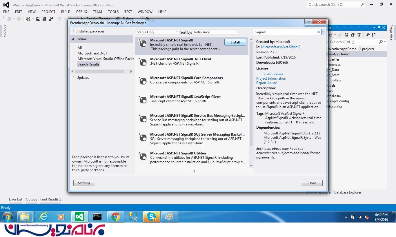 2. sinalR را در NuGet جستجو کنید و روی اولین چیزی که پیدا کرد کلیک کنید .