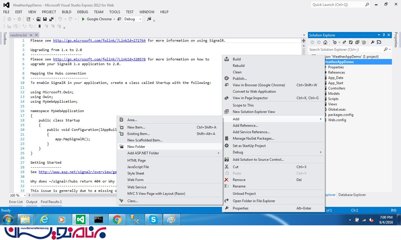 3. اضافه کردن فولدر جدید با نام SignalR