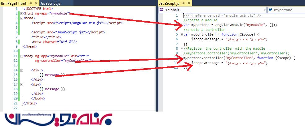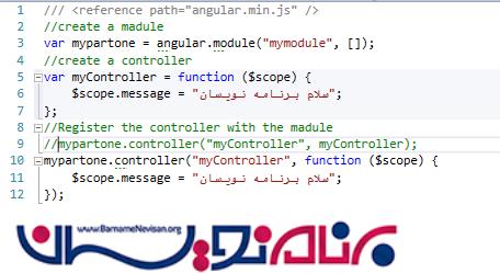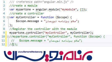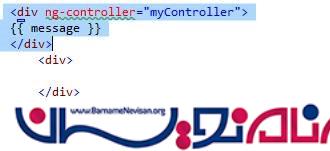 Var myController=function($scope) $scope.message=”سلام برنامه نویسان”;