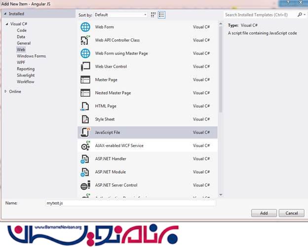 حال ، ما یک فایل جاوا اسکریپت ساده اضافه می کنیم ، ابتدا ، در پوشه ی Script خودمان این کار را انجام می دهیم.