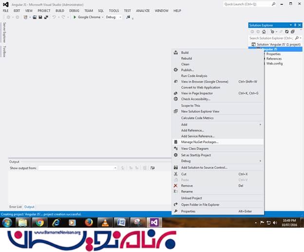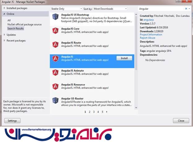 فقط یک solution ساده به نام AngularJS ایجاد می کنیم.اسکریپت های AngularJS از وب سایت رسمی دانلود کنید. همچننین شما می توانید آن را از nuget packages دانلود کنید.