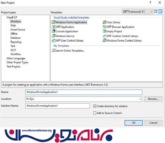 مرحله دو : "New Project" > "Windows" >"Windows Forms Application"