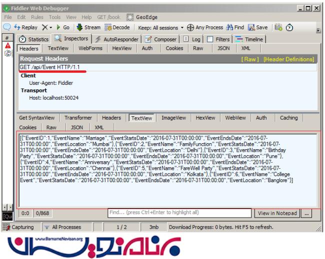 نکته: اگر شما Fiddler ندارید،میتوانید با مرورگر فقط با وارد کردن url و اجرا کردن آن را چک کنید.