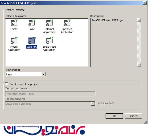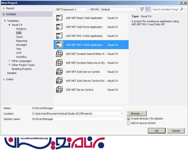 “ASP.NET MVC4 Web Application” را انتخاب میکنیم و نام پروژه مان را “MvcEventManager قرار میدهیم.